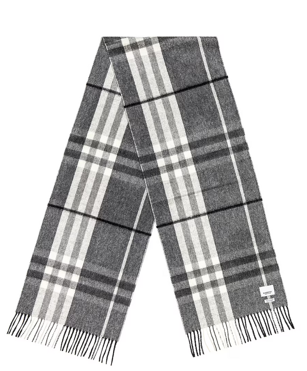 100% cashmere. Made in Scotland. Dry clean only. Fringe trim. Burberry logo patch. Measures approx 12"W x 66"L. Manufacturer Style No. 8045168.