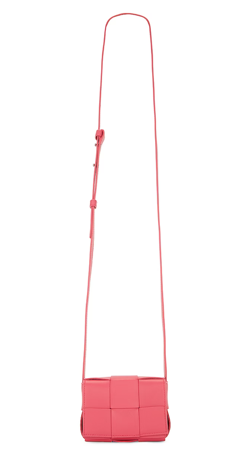 Brand: Bottega Veneta Intreccio leather with bonded lambskin liningMade in ItalyFoldover top with magnetic closureOne main compartment with single card slotAdjustable shoulder strapMeasures approx 5" W x 3.5" H x 2"...